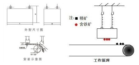 RCYB懸掛式永磁除鐵器與磁力滾筒除鐵器屬于安全設備,用來預防意外的鐵物隨被處理物料或礦石一起進入工作的機械中(特別是破碎機)。因此,懸掛式永磁除鐵器能防止機械工作中因進入鐵物而發生事故或被迫停工。