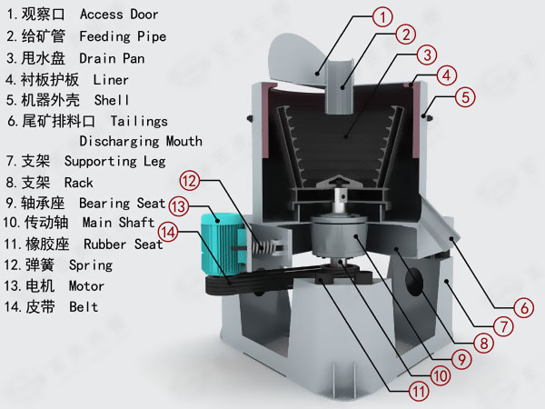 選礦離心機是由給礦管、機架、尾礦槽、驅動電機、主軸,反沖水管、精礦排料管,選礦部件等部分組成。