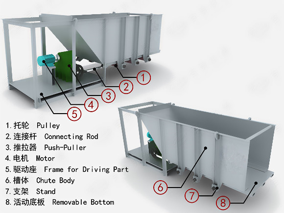 槽式給料機(jī)主要由電動機(jī)、減速機(jī)、聯(lián)軸器、偏心機(jī)構(gòu)、漏板、槽架、滾輪等幾個主要部件組成。其結(jié)構(gòu)的共同點(diǎn)是均裝有可控制料層高度的調(diào)節(jié)閘板;在輸料槽下部為一前后移動的給料板。其不同點(diǎn)是給料板角度不一樣,一般為沿卸料方向向下傾斜5度,以及更大的傾角(小于物料的靜堆積角)和角度為零的水平型等。給料板的動作有前后往復(fù)移動式,抖動式以及擺動式等,傳動機(jī)構(gòu)均為曲柄回轉(zhuǎn)式。