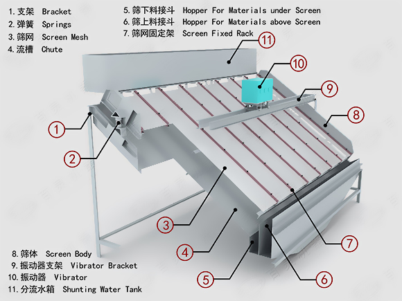 昆重礦機設(shè)計生產(chǎn)的高頻篩是由篩網(wǎng)、篩框、激振電機、橡膠彈簧、機架、給礦箱、給礦管、篩下產(chǎn)品接礦斗、篩上產(chǎn)品接礦斗等組成。為了使高頻篩的礦漿量、礦漿濃度和粒度基本相近,可根據(jù)傾角調(diào)節(jié),傾角幅度越大礦粒越細(xì),相反傾角幅度越小礦粒越粗。